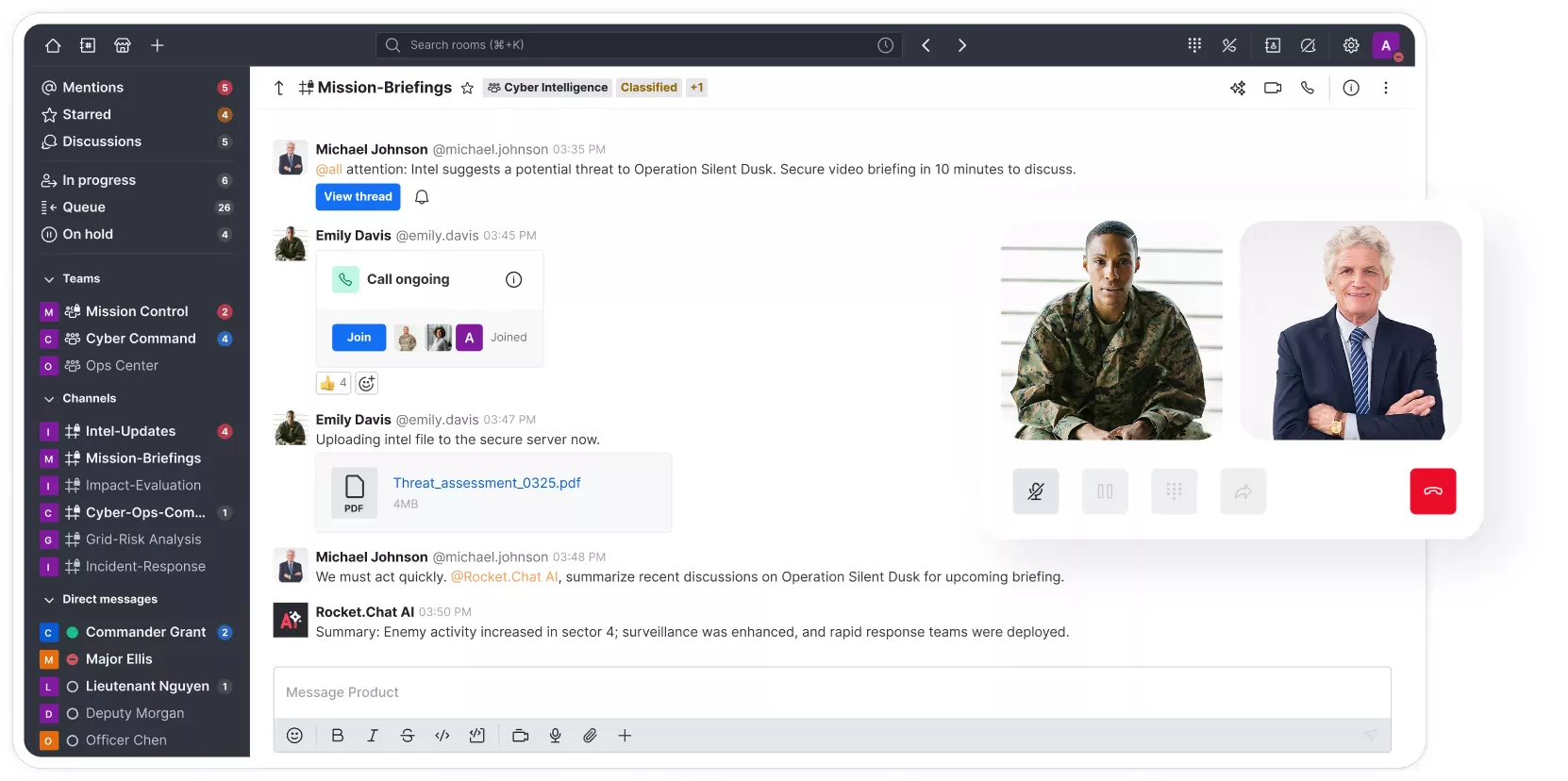 Rocket.Chat — відкрита платформа для безпечного командного спілкування, яка об’єднує чат, голосові та відеодзвінки, критичні додатки й ШІ для захисту місій і координації в умовах високої безпеки